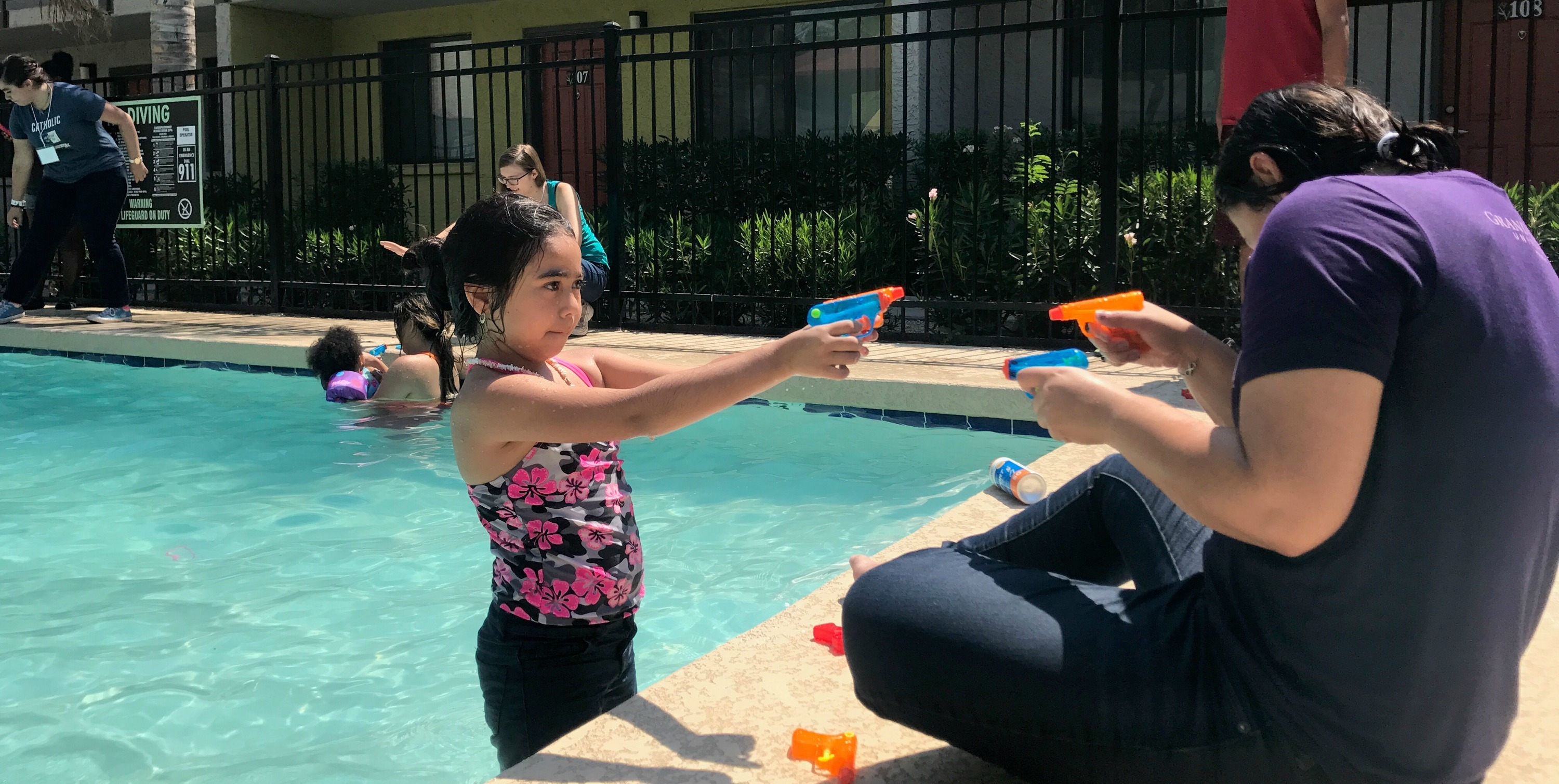 At Desert Willow, the volunteers set up stations around the community. Sidewalk chalk covered the concrete, games filled the office area, and the pool deck came alive with pool toys and squirt guns. The community came alive with sounds of laughter and splashing, as children poured out of their apartments to join the fun.